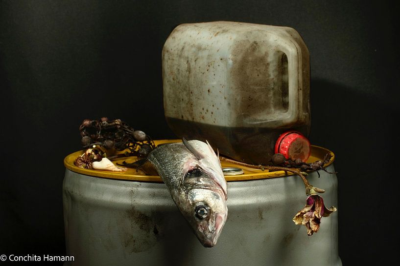 Für ein Auftragsstillleben, inspiriert durch Plastikmüll im Meer. Die Ölkanne und das Fass als Rohstoff für Plastik, das Substrat für tote Fische und die Blume als Umweltschaden. Welche Auswirkungen hat die Industrie auf das Leben und die Natur.
