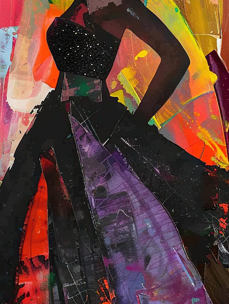 Silhouette Woman | Woman Silhouette - Auf diesem abstrakten Gemälde sehen Sie die Silhouette einer Frau, die ein auffallendes, schimmerndes Kleid trägt, umgeben von hellen und leuchtenden Farben wie Orange, Lila und Türkis, die ihr ein lebendiges Aussehen verleihen.