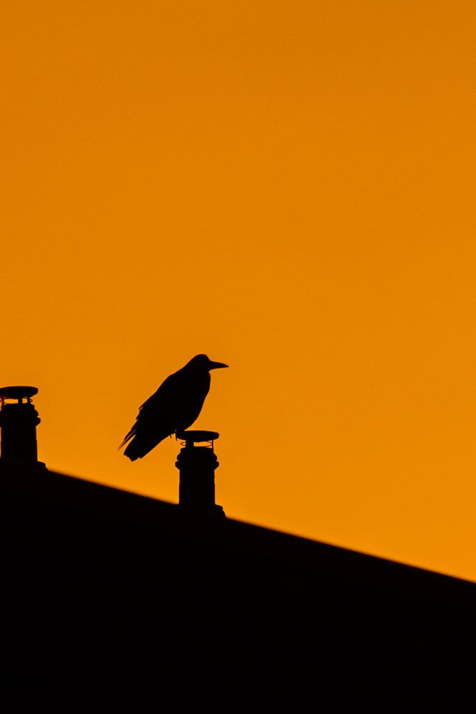 Ein grafisches Bild, das während des Sonnenaufgangs gemacht wurde. Sie sehen einen Vogel, der auf dem Dach sitzt, und der Himmel im Hintergrund ist wunderschön orange gefärbt, so dass die Silhouette des Vogels aus dem Bild herausspritzt. Das Schöne an diesem Bild ist, dass es sehr einfach ist, aber es hätte auch eine Zeichnung sein können. Einfachheit ist der Schlüssel.