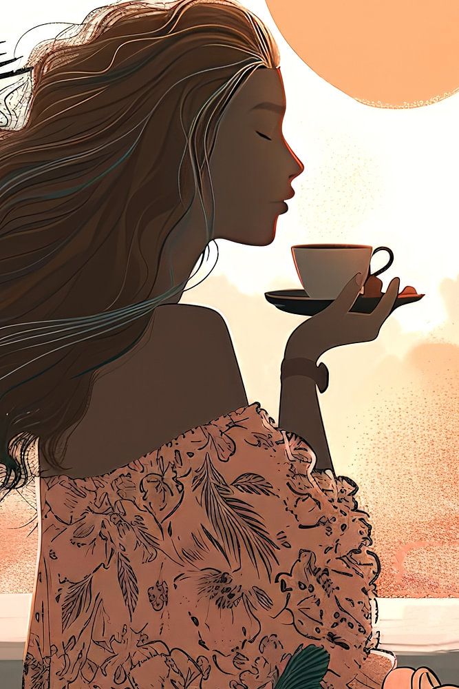 Sie steht vor einem Hintergrund, der an eine aufgehende Sonne erinnert, mit einem Himmel, der von sanften Pfirsichtönen zu einem ruhigen Beigeton übergeht. In einer nachdenklichen Pose hält sie eine Tasse Tee in der Hand, aus der sanfter Dampf aufsteigt, der die heitere Atmosphäre noch verstärkt. Die Frau ist von einer üppigen Flora umgeben, darunter große, kunstvolle Rosen und üppige Blätter, die das Bild mit einem Gefühl von Überfluss und Wachstum erfüllen.