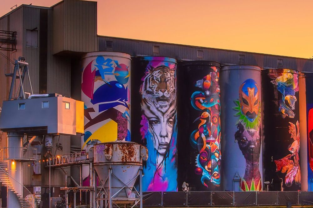 Straßenbahnkai in Den Bosch mit den Silos in der goldenen Stunde