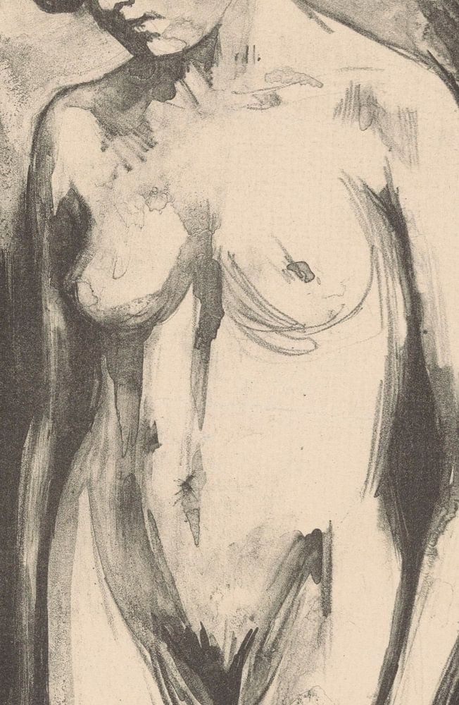 Diese Frau steht nackt auf einem Porträt, einem Aktporträt. Folglich sind ihre Beine, Hüften, ihr Oberkörper und ihre Brüste auf dem Porträt zu sehen.