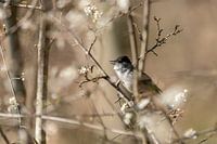 Eine Mönchsgrasmücke singt zwischen den ersten Blüten des Jahres