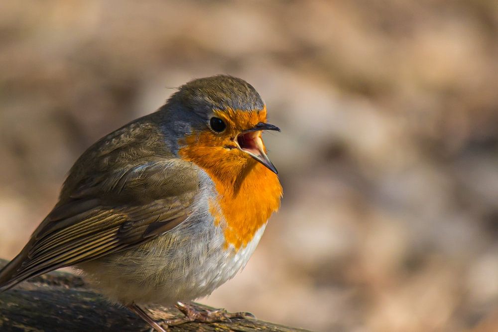 Ein Rotkehlchen singt laut an einem schönen Frühlingsmorgen.