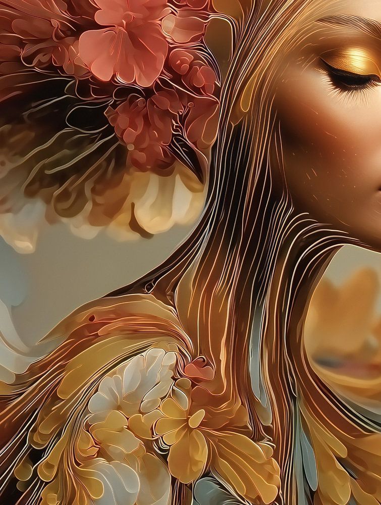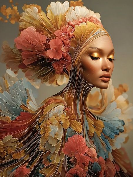Abstraktes Fantasieporträt einer Frau in weichen Pastell- und Erdtönen.