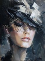 Dieses Werk zeigt das Porträt einer eleganten Frau mit Hut, das in einem lockeren, malerischen Stil ausgearbeitet wurde, bei dem der Ausdruck wichtiger ist als das Detail. Das Gesicht ist teilweise durch Schatten und Textur verdeckt, so dass das Bild nicht alles offenbart. Gerade diese Zurückhaltung macht das Porträt spannend: Der Blick…