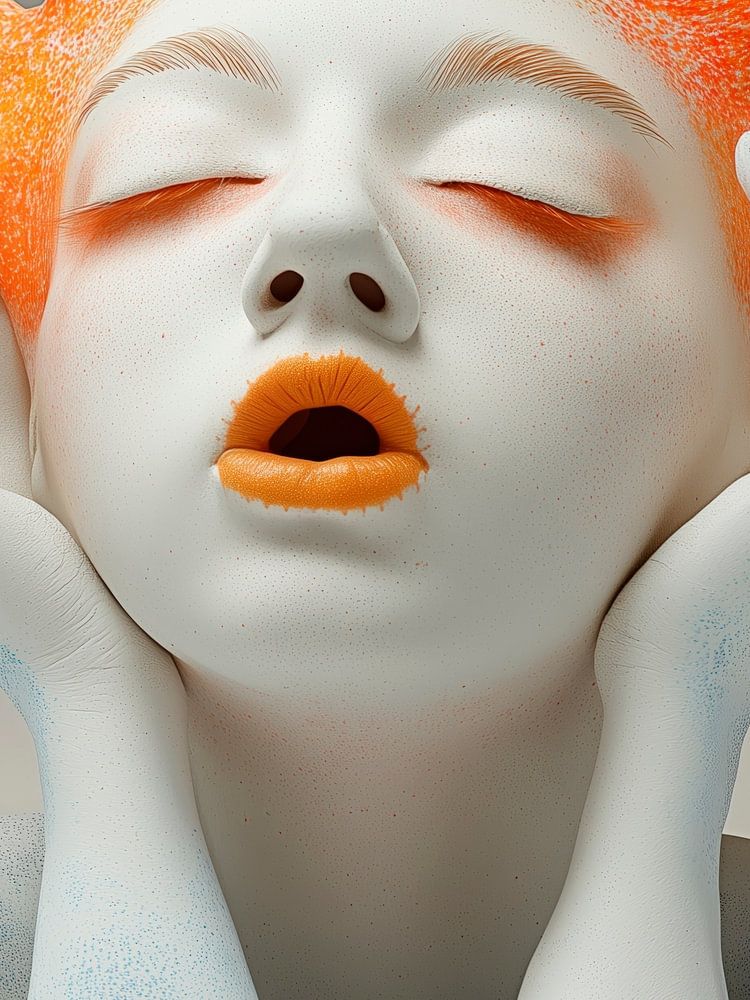 Diese zeitgenössische Interpretation einer Sirene fängt den magischen Moment des mythischen Gesangs ein. Mit geschlossenen Augen und leicht geöffneten Lippen scheint sie in ihrer eigenen melodischen Welt versunken. Die korallenartigen Strukturen in leuchtendem Orange rahmen ihr Gesicht wie eine Krone, während die blauen Hände die Verbindung zum Meer symbolisieren.