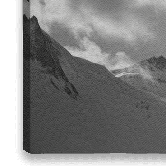 Inmitten majestätischer Gipfel, wo die Kälte der Luft die Sinne schärft, carving ein Skifahrer mit fließenden Bewegungen durch den glitzernden Neuschnee. Die dramatische Kulisse, eingefangen in Schwarz-Weiß, verstärkt die dynamische Abfahrt und den Mut, während scharfe Wolkenbänder am Himmel zu tanzen scheinen – eine perfekte Symbiose…