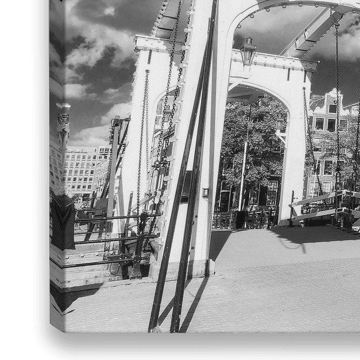 Schöne Weitwinkelaufnahme der monumentalen Skinny Bridge in Amsterdam mit kontrastreichem holländischem Himmel in Schwarz-Weiß