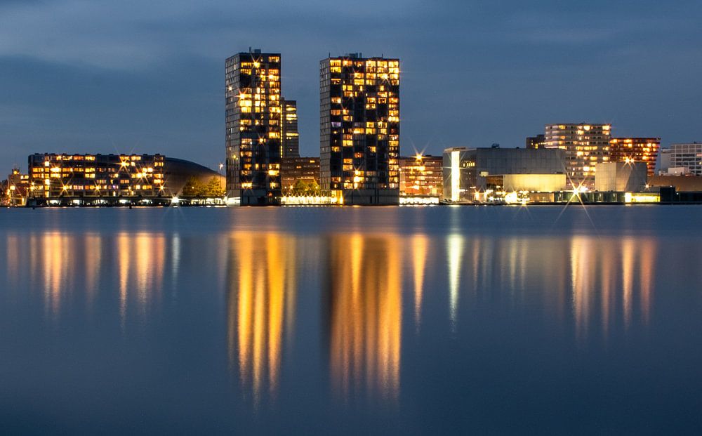 Bestelle das Foto Skyline Almere von Meine Bakker als Reproduktion auf Leinwand, Alu-Dibond, als Poster, Fototapete oder Acrylglasbild.