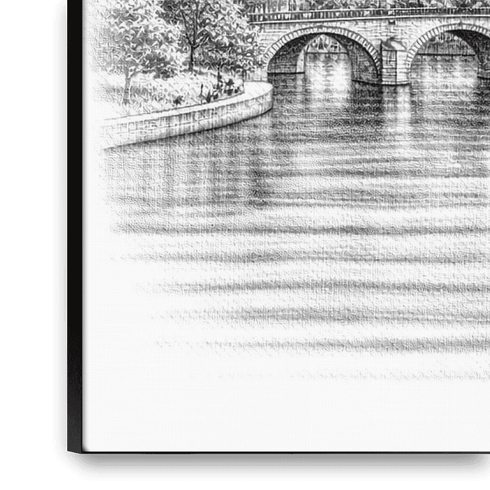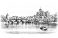 Dieses Kunstwerk zeigt eine detaillierte Schwarz-Weiß-Illustration einer stimmungsvollen europäischen Stadtlandschaft an einem breiten Fluss. Links im Bild steht eine imposante Steinbogenbrücke mit mehreren Bögen, hinter der sich ein runder Turm mit einem spitzen Dach erhebt. Im Vordergrund fährt ein Boot ruhig über das Wasser, was der…