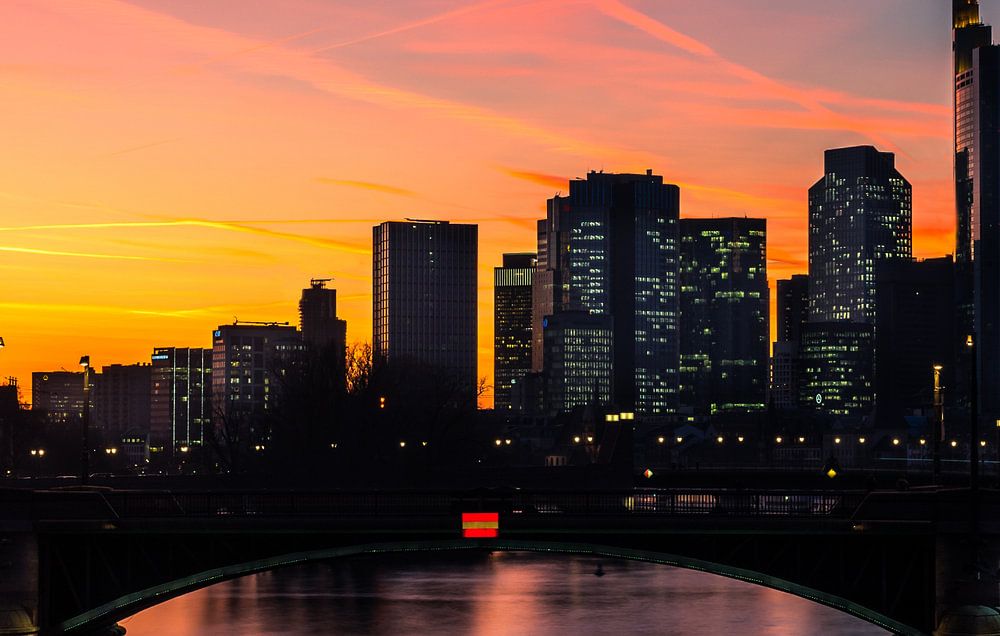 Dieses Foto ist kurz nach dem Sonnenuntergang im Frühling entstanden. Die letzten Sonnenstrahlen haben den Himmel in fantastische Farben gefärbt. Die Bürogebäude hatten ihre Lichter an und haben diesem Foto ein ganz besonderen Flair verliehen.