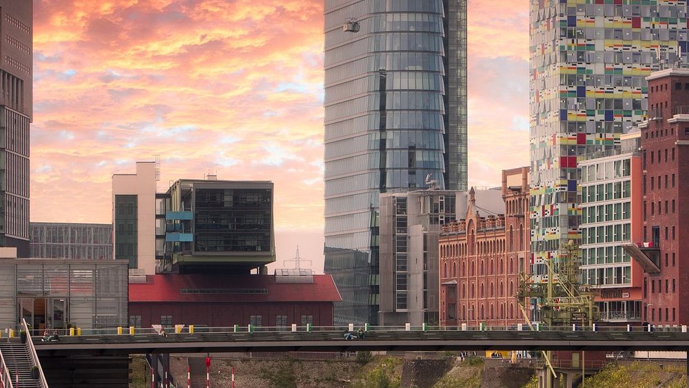 Dieses Foto zeigt einen Teil dieses Gebiets mit seiner Skyline. Der Medienhafen ist in erster Linie ein Ort mit interessanten Gebäuden, die ab den 1990er Jahren hier errichtet wurden.