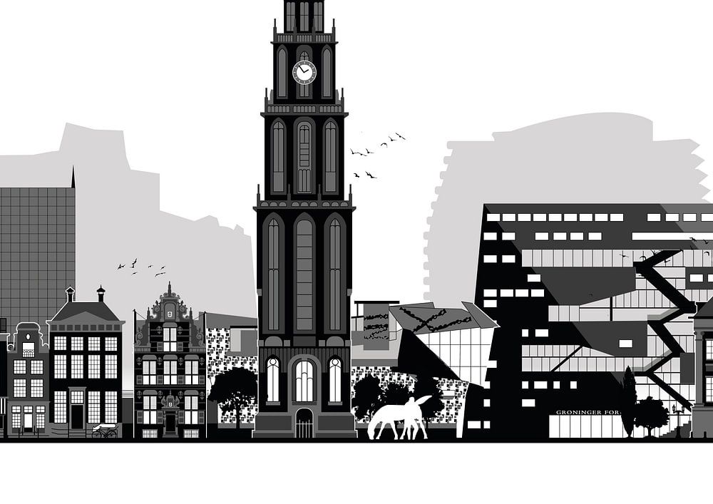 Mit charakteristischen Gebäuden wie dem Martini-Turm, dem Raadshuis, den Peerd van Ome Loeks, dem Groninger Forum, den Drie Gezusters, dem Goudkantoor und dem Groninger Museum. Im Hintergrund die Umrisse des Gasunie-Gebäudes und des Kempkensbergs.