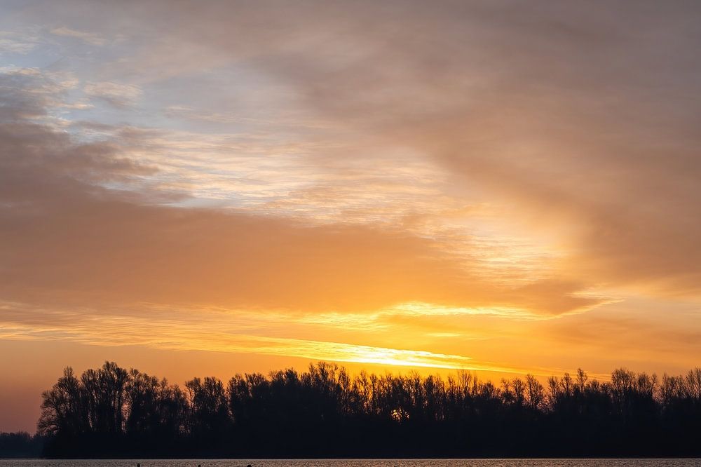 Landschaft an den Slijk-Ewijk-Seen in Slijk-Ewijk, Gelderland, mit Blick auf den See und eine fast aufgehende Sonne, die dem Himmel eine schöne Farbe verleiht