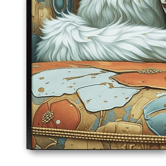 Eine prächtige weiße Langhaarkatze liegt entspannt auf einem opulent gemusterten Sessel. Ihre leuchtend grünen Augen blicken ruhig und aufmerksam , die rosa Nase und die weichen Schnurhaare setzen feine Kontraste. Die Katze mustert etwas aufmerksam im Zimmer. Nur sie weiss was sie mit dem Blick verfolgt. Die Bildstimmung ist ruhig, elegant und leicht aristokratisch — ein stiller Moment royaler Gelassenheit.