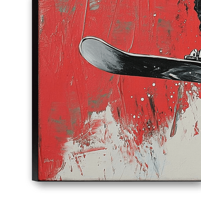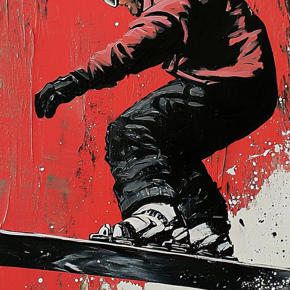 Snowboarder - Dieses Sportgemälde zeigt einen Snowboarder, der mit großer Dynamik durch die Luft gleitet, während die kräftigen Farben Rot und Schwarz die Action und Energie des Sports unterstreichen.