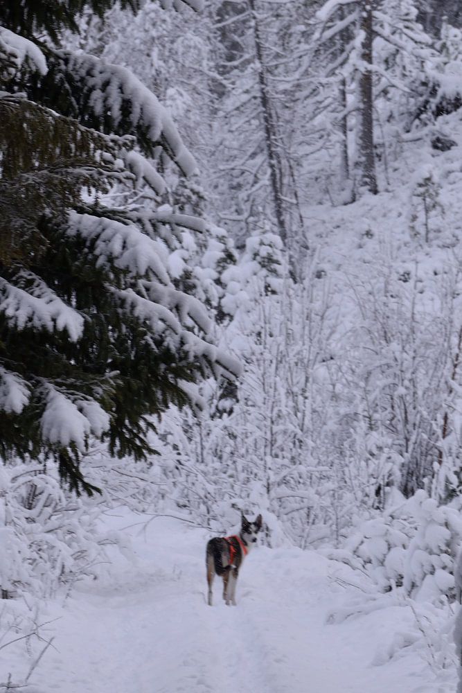 Snowy trees and a Husky