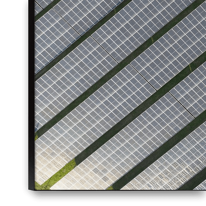 Bestelle das Foto Solarmodule aus der Luft, die sauberen erneuerbaren Strom erzeugen von Sjoerd van der Wal Fotografie als Reproduktion auf Leinwand, Alu-Dibond, als Poster, Fototapete oder Acrylglasbild.