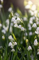 Wunderschöne Leucojum aestivum-Blüten, auch bekannt als Spätblühende Knotenblume oder Sommer-Knotenblume. Die zarten weißen Blüten mit ihren hängenden, glockenförmigen Blütenblättern hängen anmutig an einem gebogenen Stängel, der sich von einem unscharfen Hintergrund aus grünem Laub abhebt, das in sanftes Sonnenlicht getaucht ist. Das…