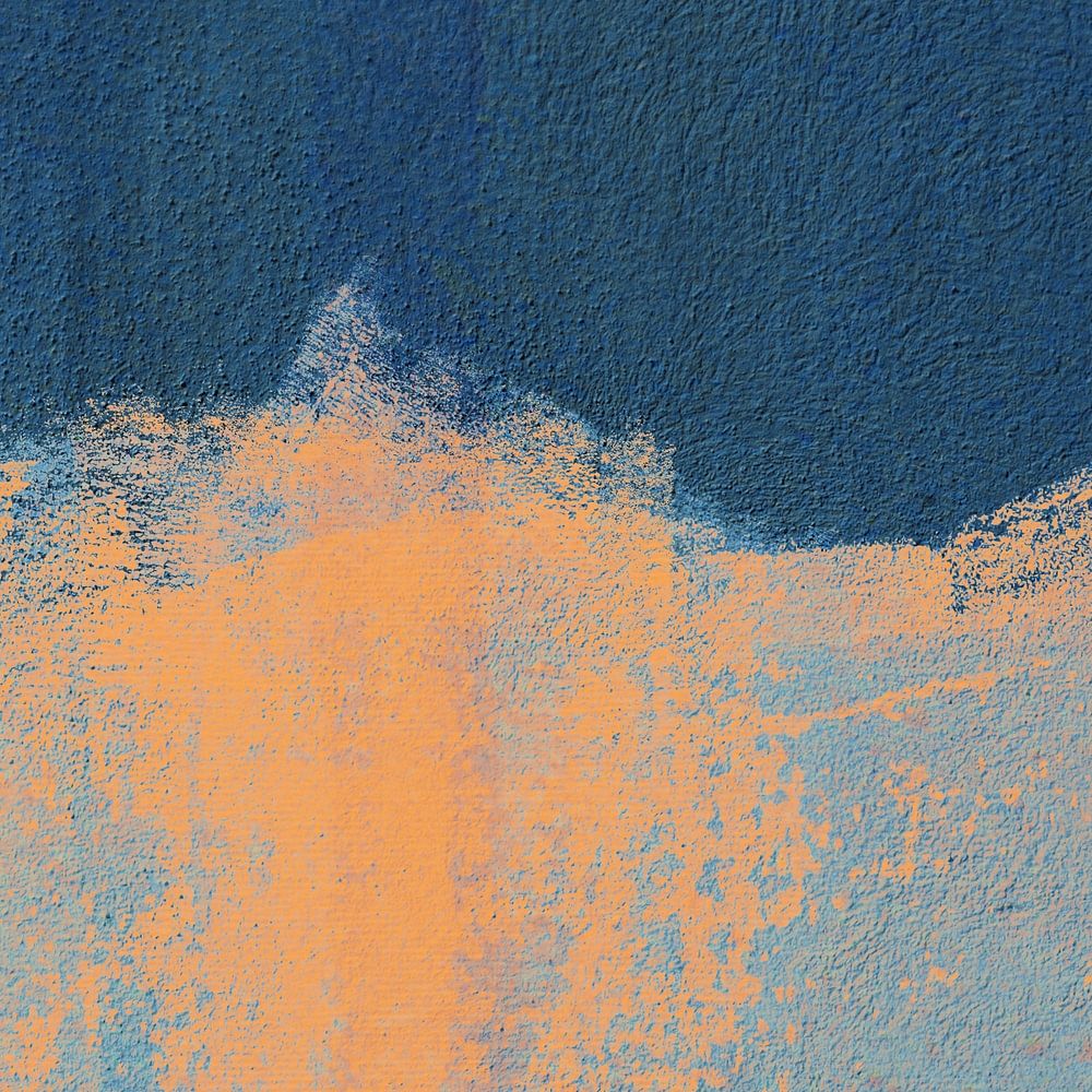 Abstrakte Küstenlandschaft mit Strand und Meerwasser in kräftigem Orange und Marineblau mit einer körnigen Textur.