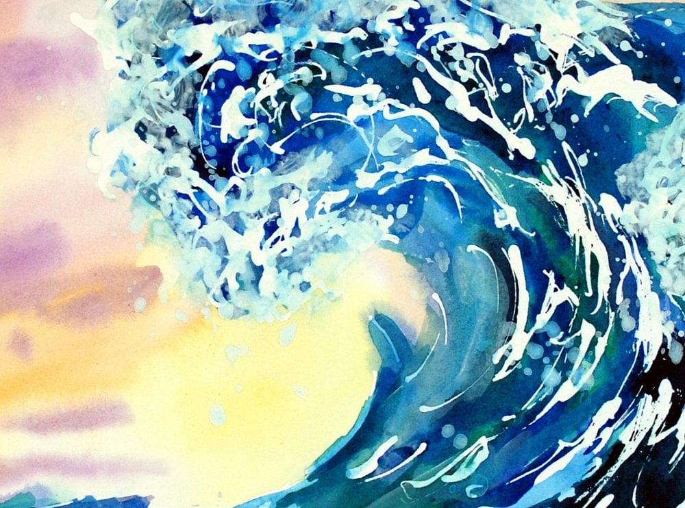 Wasserfarben Kunstwerk von großen blauen Wellen irgendwo im Ozean unter einem farbenfrohen Abendhimmel und Sonnenuntergang.