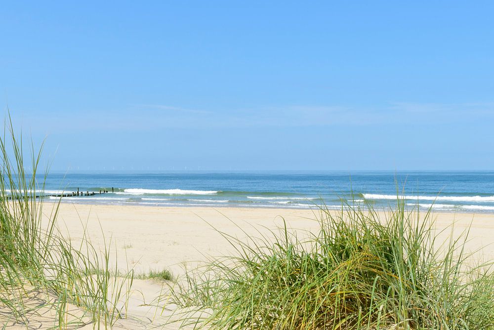 Dünengras auf Sanddünen am Strand an einem Sommertag . Wellen rollen den leeren Strand. Panoramabild .