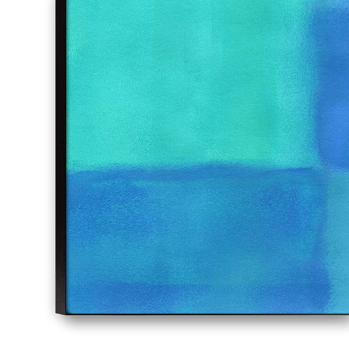 Eine beruhigende Mischung aus Blau- und Türkistönen prägt das Bild. Die Farben sind als geometrische rechteckige Flächen angeordnet und erzeugen eine heitere und besonnene sommerliche Atmosphäre und unterstreichen den minimalistischen, abstrakten Stil.