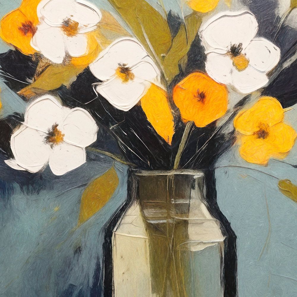 Eine mit weißen und orange-gelben Blumen gefüllte Glasvase hebt sich von einem sanftblauen Hintergrund ab und erzeugt eine ruhige und friedliche Atmosphäre. Die leuchtenden Blütenblätter bilden einen Kontrast zur transparenten Oberfläche der Vase und verleihen ihr Zartheit und Ausgewogenheit.