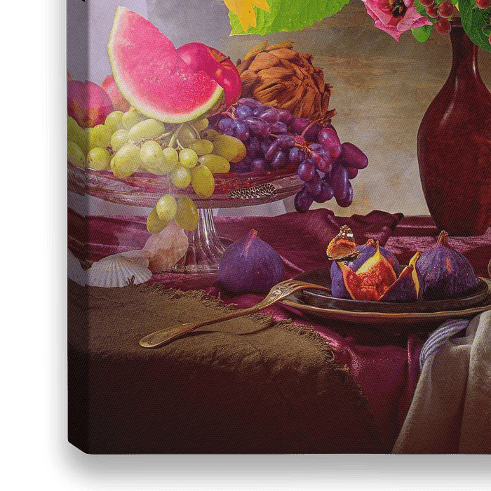 Stilleben eines üppigen Blumenstraußes mit Chrysanthemen, Rosen, Sonnenblumen und Glocken. Im Vordergrund links eine große Glasobstschale mit Trauben und Wassermelone. Im Vordergrund ein Zinnteller mit Feigen . Ein weißes Leinen-Geschirrtuch mit hellblauen Streifen rechts vom Teller. Ein Kristallglas mit Likör auf der rechten Seite der…