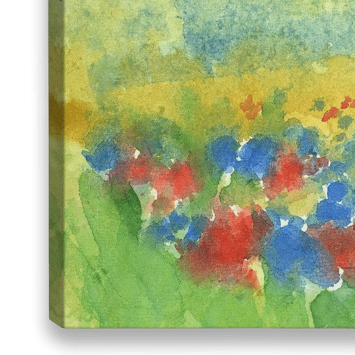 Dieses Aquarell einer friedlichen Sommerlandschaft erfreut das Herz von Naturliebhabern. Wunderschöne Wildblumen wie roter Mohn und blaue Kornblumen blühen auf einer grünen Wiese, die bis zum Horizont führt, mit Bäumen in…