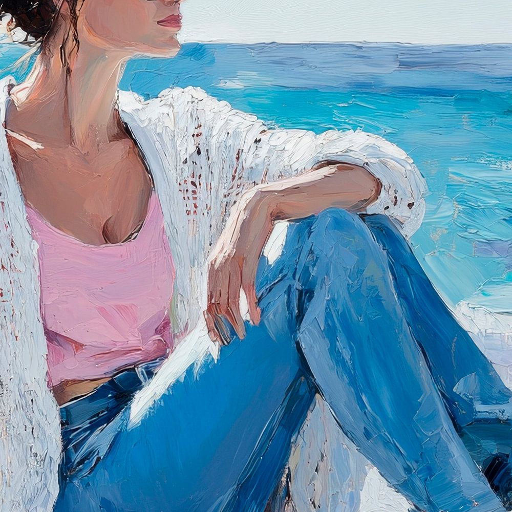 In einem Moment der perfekten Stille genießt eine beeindruckende Frau die sanften Wellen des Meeres. Ihre Sonnenbrille reflektiert das Licht der Sonne, während der weiße Pullover über ihrem zarten Oberteil sanft im Wind flattert. Barfuß und tiefenentspannt sitzt sie auf den Felsen, mit dem Blick auf den Horizont gerichtet, wo Himmel und Wasser ineinanderfließen.