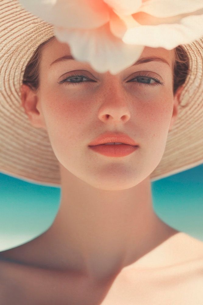 Ein strahlendes Porträt der Sommerfrische, wo die sanften Wellen des Meeres auf einen schlichten Streifenbikini treffen. Die zarte Blüte, die kunstvoll auf dem großzügigen Hut platziert ist, verleiht der Szene einen Hauch von Eleganz und Leichtigkeit. Der Blick ist fest und überzeugt, wie eine Muse, die den Sommer mit Stil und Anmut verkörpert.