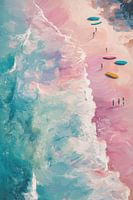 Eine Strandszene in sanften Pastelltönen, wo türkisfarbene Wellen auf das rosa Ufer treffen. Kleine Figuren flanieren zwischen bunten Sonnenschirmen am Strand entlang, während die schäumende Brandung eine natürliche Grenze zwischen Wasser und Land bildet. Durch die Verwendung sanfter, fließender Farben und minimalistischer Komposition…