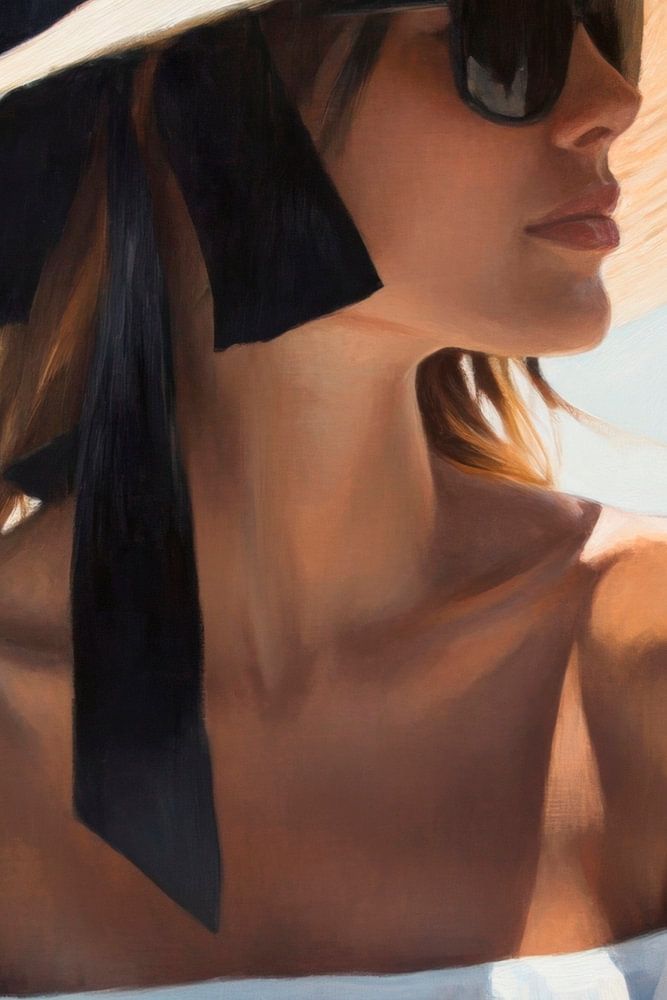 Ein strahlender Sommertag, an dem die sanfte Brise das breite Strohhutkreationsmillimeterweise anhebt. Elegante Sonnenbrille spiegelt die Welt wider, während der fließende, weiße Stoff leicht über die Schultern gleitet. Ein Hauch von Raffinesse mischt sich mit der unbeschwerten Leichtigkeit des Moments – pure Sommertraum-Ästhetik.