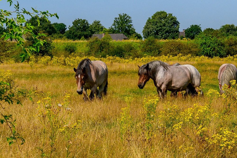 Dieses einzigartige Foto wurde im Sommer 2024 aufgenommen, einer Zeit, in der sich die Natur von ihrer schönsten Seite zeigt. Durch die Kombination der natürlichen Elemente und der beeindruckenden Erscheinung der belgischen Zugpferde entsteht ein bezauberndes Bild, das die ruhige, warme Atmosphäre eines Sommertages in den Niederlanden perfekt einfängt. Diese Landschaft weckt Gefühle der Freiheit und der Verbundenheit mit der Natur und ist somit ideal für alle, die im Alltag ein wenig Ruhe suchen.