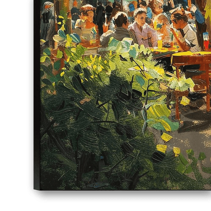 Das Bild zeigt einen belebten und schattigen Biergarten. Die Menschen sitzen entspannt an Tischen, die von Bäumen und Sonnenschirmen umgeben sind. Die Sonne dringt durch die Blätter und erzeugt ein Spiel aus Licht und Schatten auf dem Boden. Das Kunstwerk strahlt eine ruhige und freundliche Atmosphäre mit einem Hauch von sommerlicher Lebendigkeit aus. Der Stil ist impressionistisch, mit sichtbaren und energischen Pinselstrichen. Ein Gemälde in sommerlichen Atmosphären.