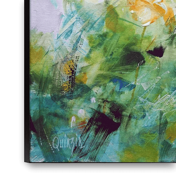 Sommerstrauß - Die Frische eines Schnittblumenstraußes. Hierbei handelt es sich um eine abstrakte Blumenkomposition in sauren Farbtönen, die mit Acrylfarbe auf Leinwand gemalt wurde.