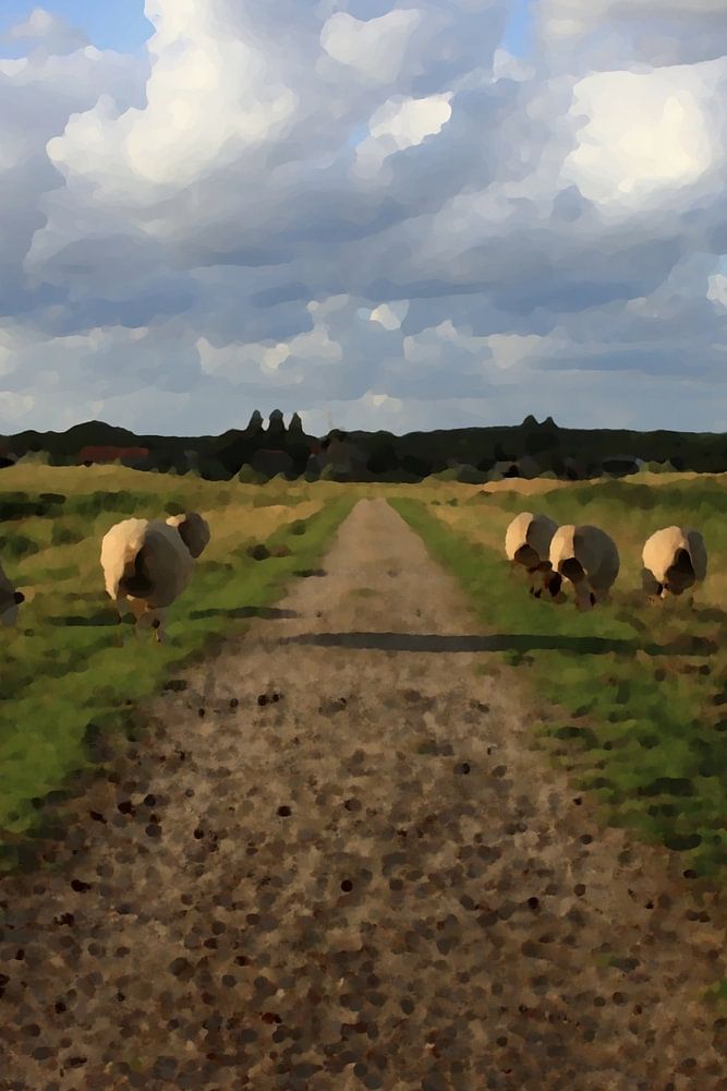 Eine schmale Landstraße windet sich durch die grüne Landschaft, flankiert von Schafen, die friedlich im hohen Gras grasen. Die vertikale Komposition betont die Tiefe des Weges und den weiten Himmel darüber, so dass der Betrachter das Gefühl hat, direkt hineinlaufen zu können. Diese Porträtversion fängt die Ruhe, die Weite und den ländlichen Charme eines Sommertages ein.