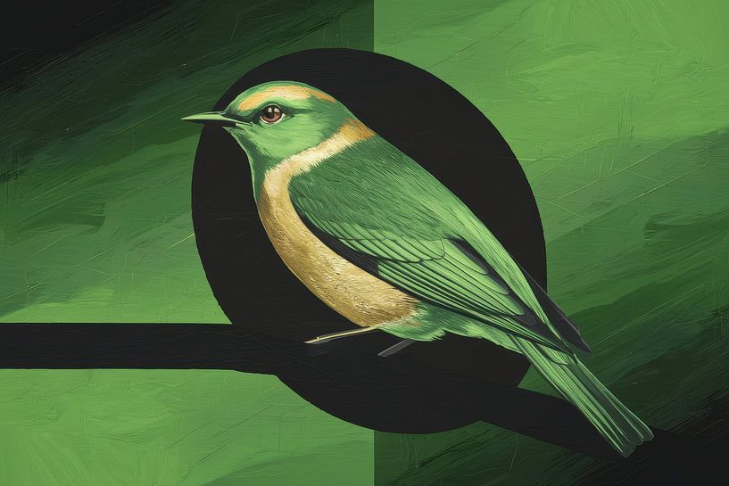 Ein kleiner grüner Singvogel sitzt konzentriert auf einem glatten Ast, wobei ein dunkler Kreis seine Silhouette kraftvoll umrahmt. Mehrschichtige Grüntöne und diagonale Pinselstriche bilden einen ruhigen Hintergrund, während die hellgelbe Brust einen subtilen Kontrast zu den tiefen Schatten bildet. Die kompakte Komposition und der…