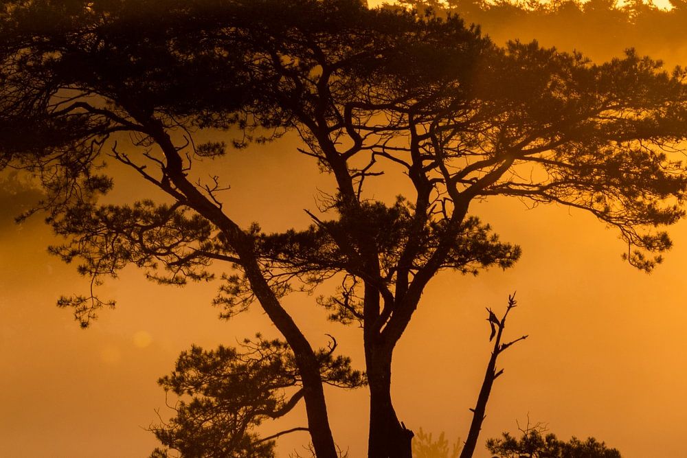 Ein Baum im Nebel, aufgenommen am Morgen bei aufgehender Sonne.