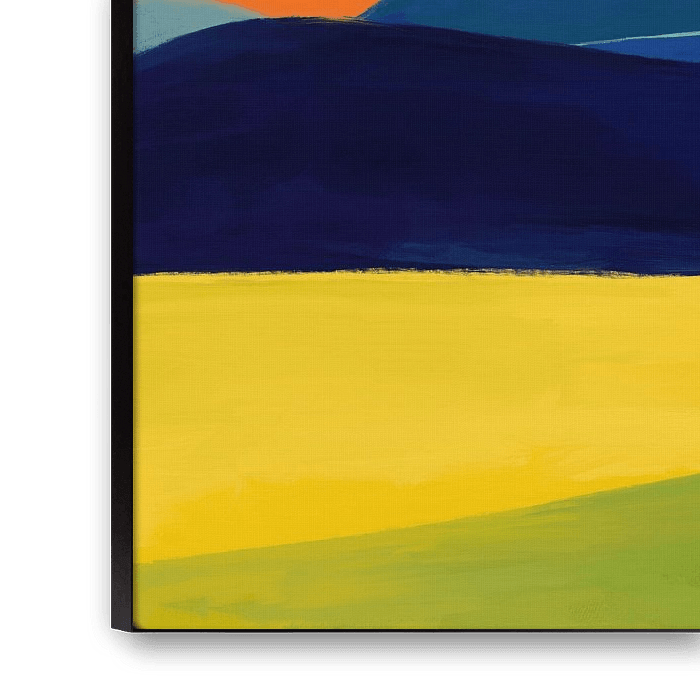 Eine kühne, abstrakte Landschaft, die Geometrie und Emotionen miteinander verbindet. Leuchtend gelbe Felder treffen auf tief indigoblaue Hügel unter einer glühenden orangefarbenen Sonne und schaffen ein beeindruckendes Gleichgewicht aus Wärme und Ruhe. Dieses Werk fängt die Essenz des modernen Minimalismus und die Lebendigkeit der Natur durch vereinfachte Formen und Farbharmonie ein