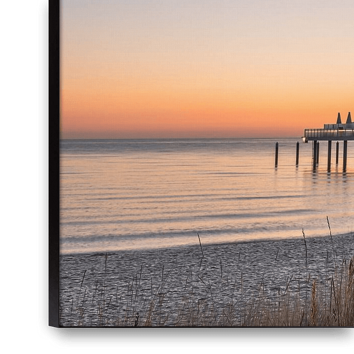 Bestelle das Foto Sonnenaufgang am Teehaus in Timmendorfer Strand von Ursula Reins als Reproduktion auf Leinwand, Alu-Dibond, als Poster, Fototapete oder Acrylglasbild.