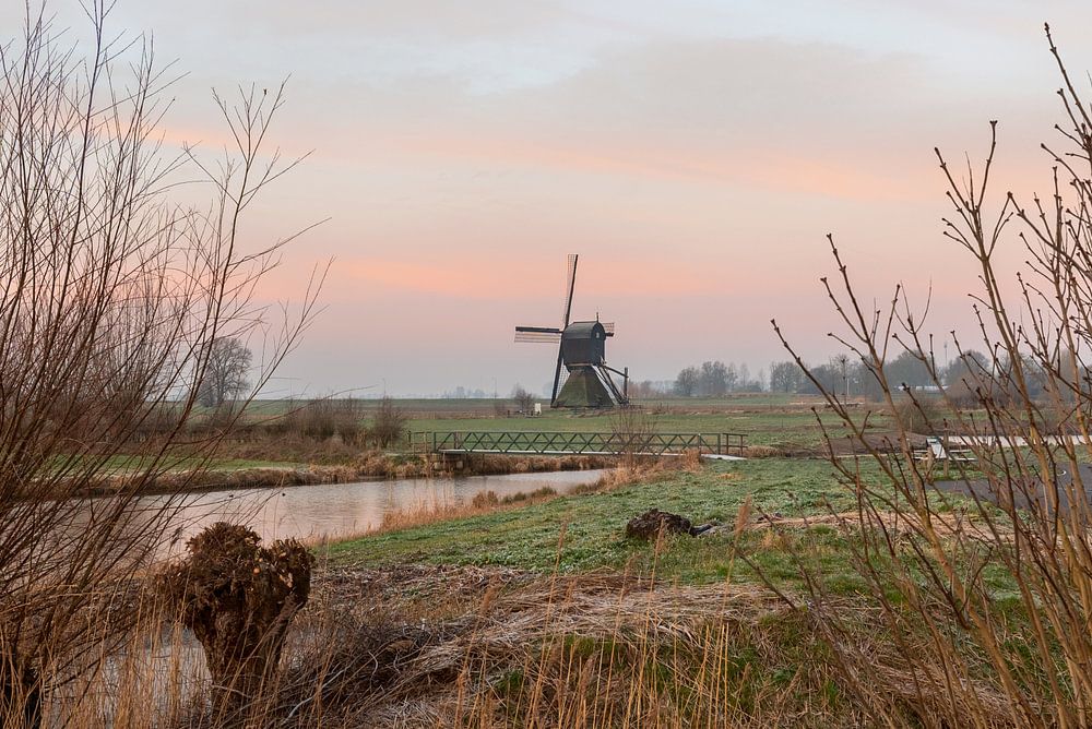 Sonnenaufgang an der Windmühle an einem Wintermorgen.