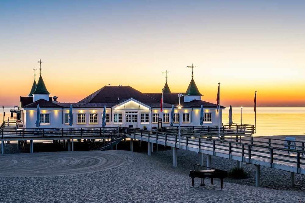 Sonnenaufgang auf der Seebrücke in Ahlbeck auf der Insel Usedom an der Ostsee
