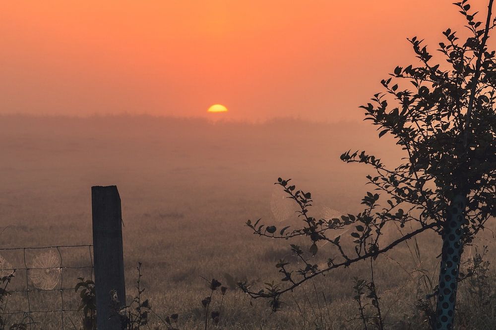 An einem Sommermorgen geht die Sonne im Nebel über einem Feld in Hessen auf, Zaun und kleiner Baum als Silhouette im Vordergrund