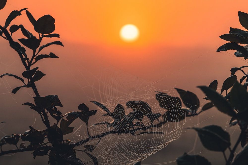 An einem Sommermorgen geht die Sonne im Nebel über einem Feld in Hessen auf, Zweige mit Spinnennetzen im Vordergrund