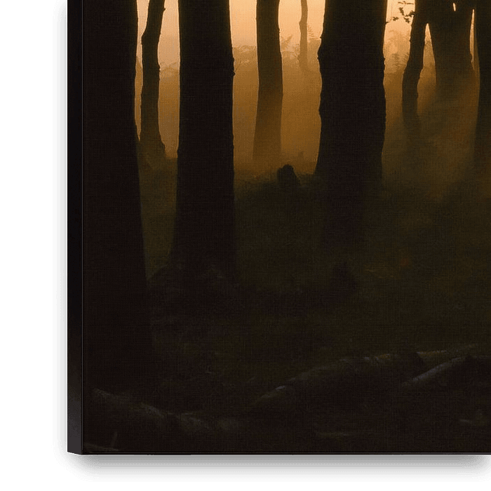 Die aufgehende Sonne beleuchtet die zwischen den Bäumen liegende Nebelschicht.