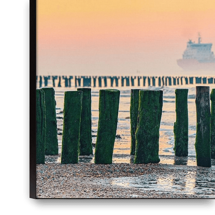 Sonnenaufgang an überwucherten Pfählen in Zeeland mit einem vorbeifahrenden Schiff und Morgennebel.