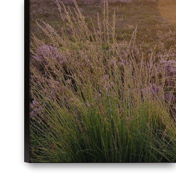 Bestelle dieses Landschafts-Wandbild Sonnenaufgang in einer Heidelandschaft mit blühenden Heidekrautpflanzen von Sjoerd van der Wal Fotografie als Reproduktion auf Leinwand, Alu-Dibond, als Poster, Fototapete oder Acrylglasbild.